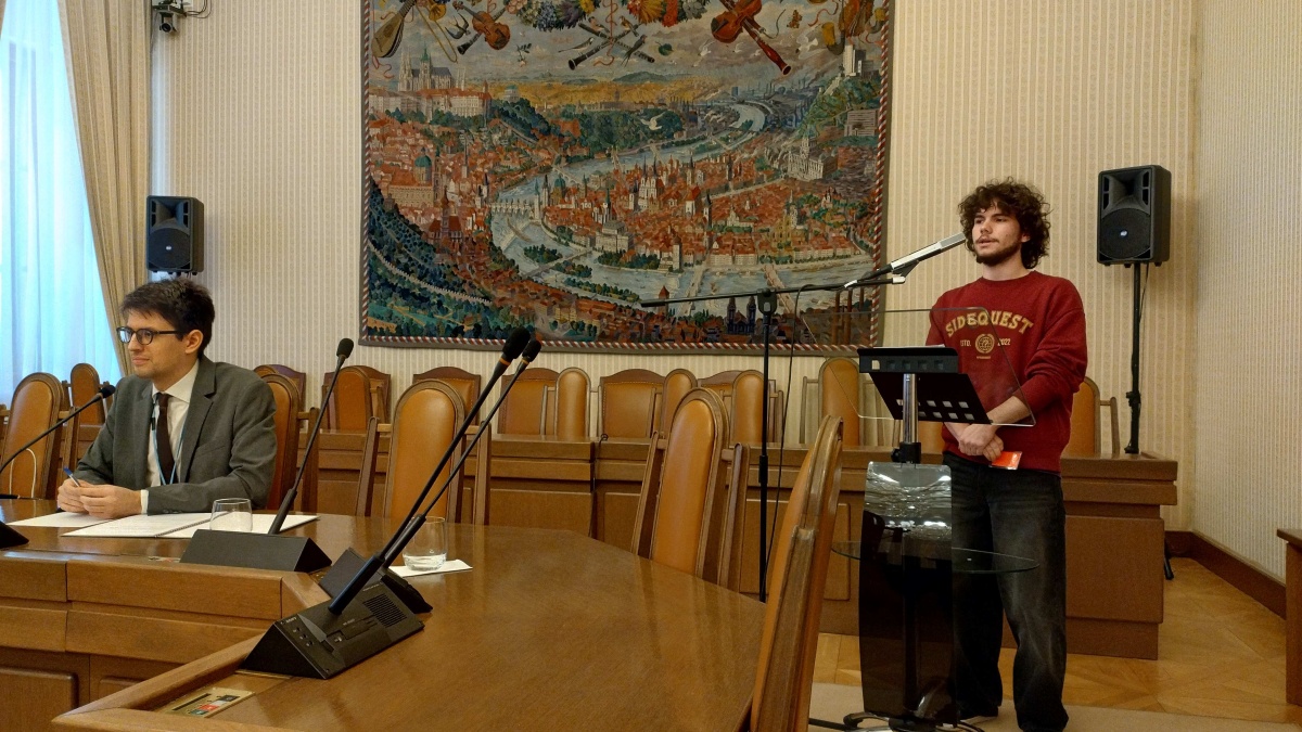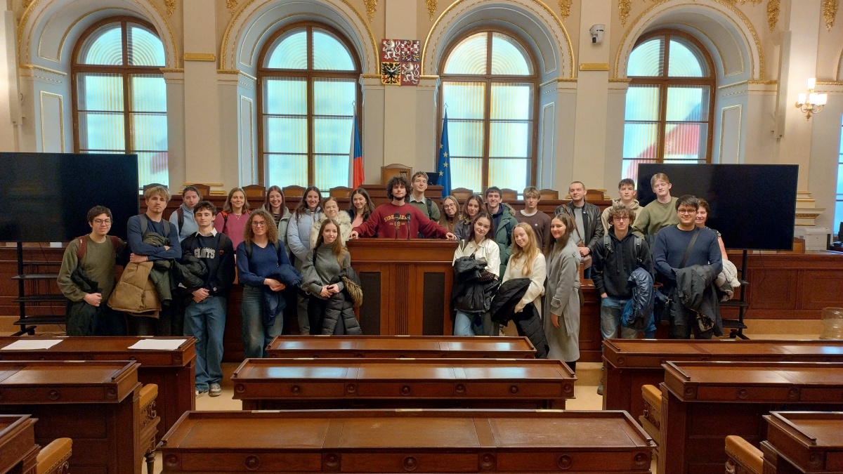 Nejprve jsme zhlédli krátký, ale poučný dokument o parlamentu a následně jsme prošli podrobnou kontrolou za přítomnosti policie. Náš pan průvodce nám sdělil spoustu zajímavých informací a během poutavého výkladu nás prováděl budovou. Navštívili jsme Velký jednací sál, kde se schvalují zákony, a z venkovní terasy jsme obdivovali výhled na Prahu. Závěrem prohlídky jsme se dostali do sálu JUDr. Dagmar Burešové, kde pro nás byla připravena simulace schvalování zákona. Ve třech názorově odlišných skupinách jsme projednávali, zda by se mělo volební právo nabýt už v 16 letech. Po rozsáhlé debatě a vířivé argumentační přestřelce se odhlasovalo, že v našem případě bychom zákon schválili – s 15 hlasy pro a 7 proti.