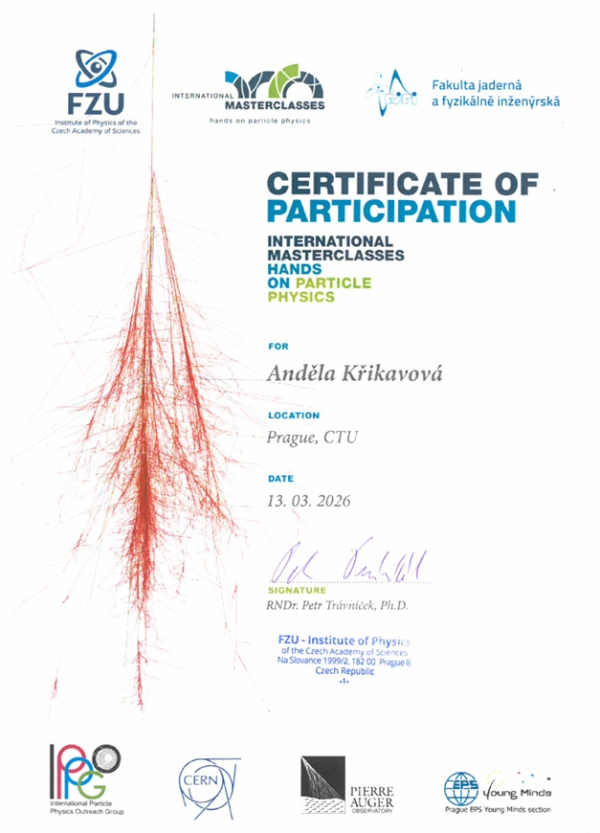 Studentka Anděla Křikavová (3. B) se zúčastnila dvou mezinárodních fyzikálních Masterclass, které proběhly 13. a 20. března 2026 ve spolupráci s odborníky z Fyzikálního ústavu AV ČR.