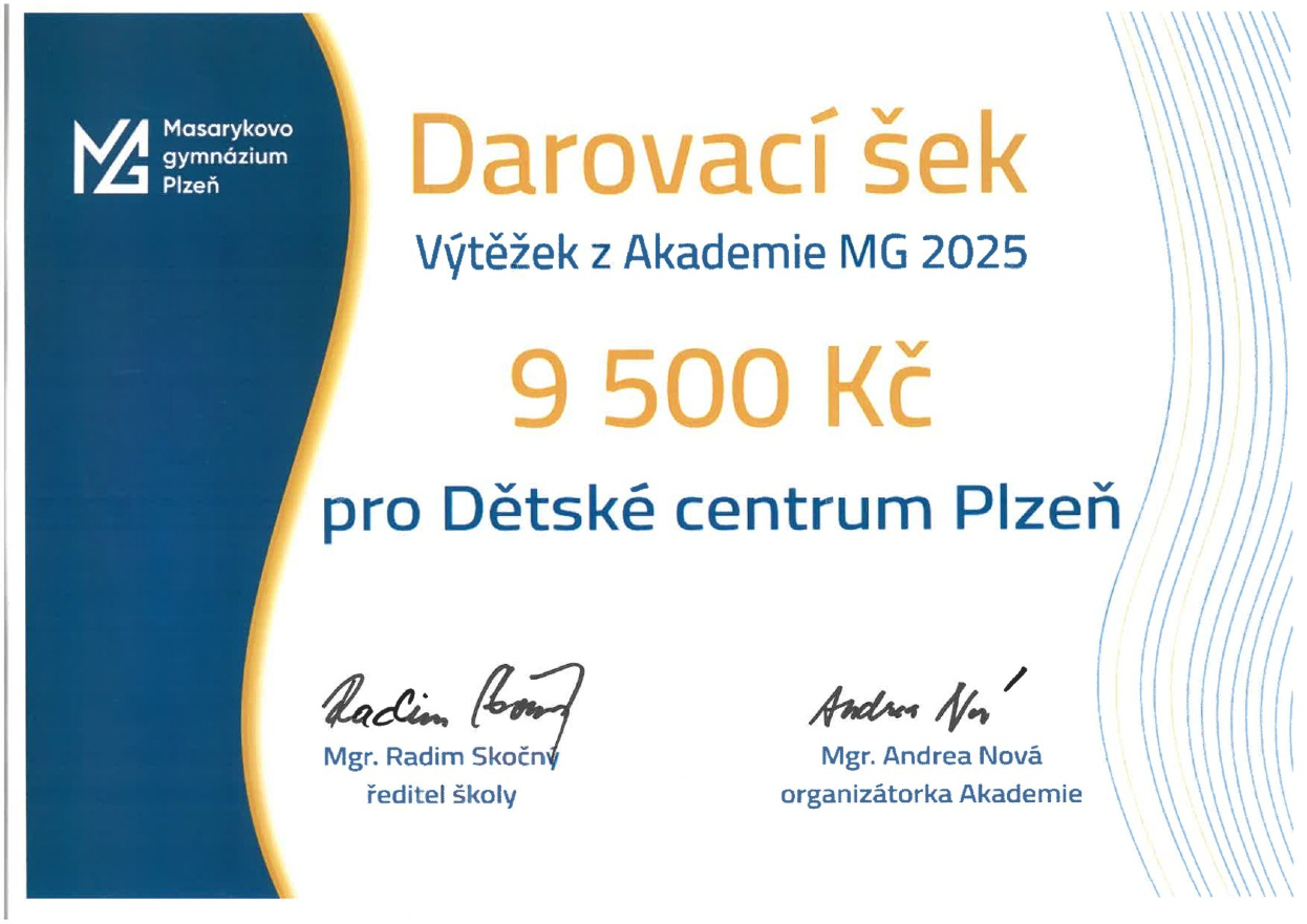 Akademie Masarykova gymnázia, která proběhla 25. 11. 2025, se opět báječně vydařila. Výtěžek z dobrovolného vstupného tentokrát věnujeme Dětskému centru Plzeň. Jsme moc rádi, že můžeme pomáhat, a děkujeme vám všem, kteří jste přispěli.