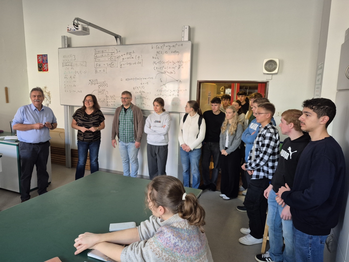 Skupina 13 bavorských žáků 11. třídy přírodovědného zaměření (odpovídá sextě či 2. ročníku českého gymnázia) doprovázená ředitelem OGO Ludwigem Pfeifferem a jeho kolegou Alexandrem Domanowskym ráno dorazila do naší školy, kde všechny přivítal ředitel MG Radim Skočný. Následovala prohlídka školy a učeben včetně krátkého nahlédnutí do hodin informatiky, hudební výchovy, zeměpisu, biologie či matematiky.