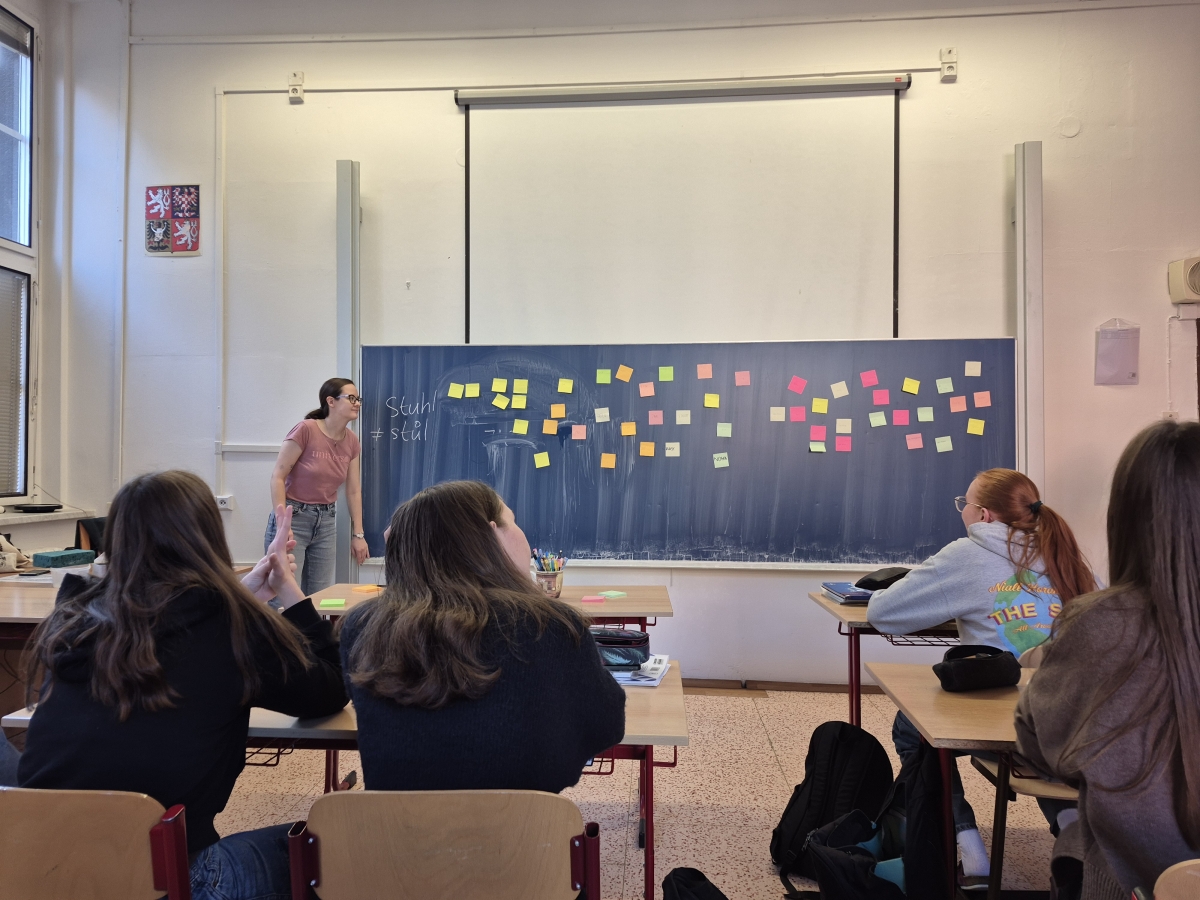 Během třetí vyučovací hodiny se bavorská skupina zúčastnila interaktivní hospitace v kvintě B v hodině německého jazyka vedené Radkou Malinovou. Žáci se během společných aktivit seznámili s rozdíly mezi českou a německou slovní zásobou, srovnávali různá slovíčka v češtině a němčině, narazili na řadu germanismů, internacionalismů a dalších společných slov pro oba jazyky. Velké rozčarování naopak přineslo zjištění, že der Stuhl není stůl, ale židle a že strom není der Strom, nýbrž der Baum!