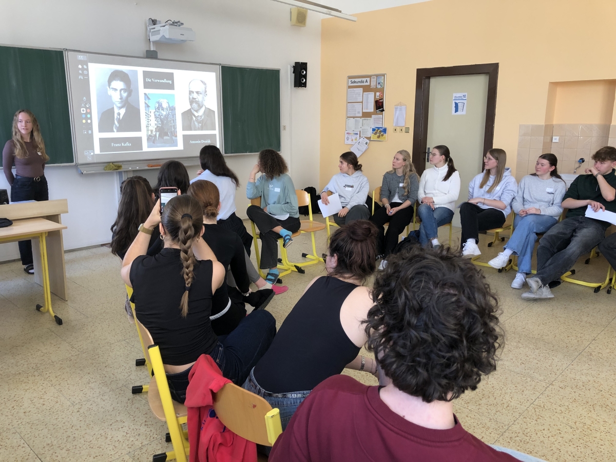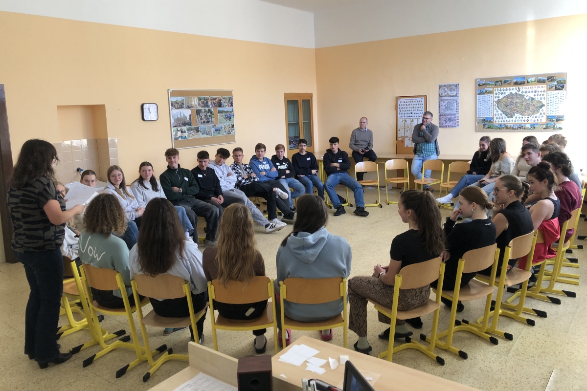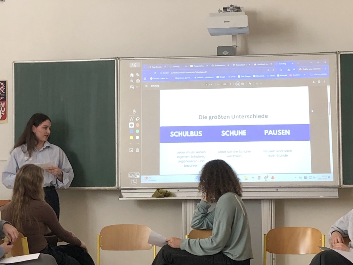 Ve čtvrté vyučovací hodině naši hosté navštívili další hodinu němčiny – tentokrát v septimě B u Šárky Hruškové. Hodinu zahájili konverzační aktivitou se soutěžním úkolem, která podobně jako aktivity v předcházející hodině skvěle zafungovala jako icebreaker a „prolomila ledy“. Následně si žákyně Linda Hekrová a Marie Protivová připravily poutavé prezentace o České republice a české kultuře a o české škole a našem vzdělávacím systému. V kruhu mezi sebou obě strany diskutovaly o těchto tématech a následně čeští žáci učili své bavorské vrstevníky základní fráze v češtině, všichni si vyzkoušeli správnou českou výslovnost a nakonec mezi sebou všichni žáci konverzovali – česky i německy.