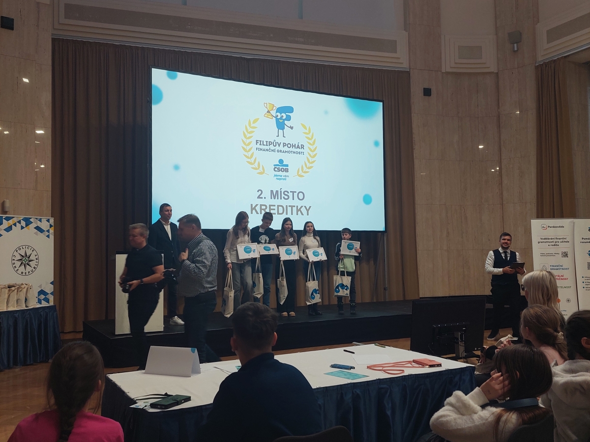 Dne 26. 1. 2026 Masarykovo gymnázium úspěšně reprezentovali nejmladší žáci školy z primy B. Tým KREDITKY ve složení David Krýsl, Pavel Kocián, Kateřina Ježková, Aneta Kučerová a Elena Veselá uspěli v republikovém finále soutěže s ČSOB Filipův pohár, kde se umístili na 2. místě.