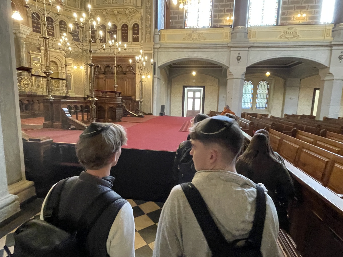V úterý 14. dubna jsme se v rámci společenskovědního semináře vypravili po stopách židovské cesty v našem městě. Kolem Staré synagogy jsme došli až k Velké synagoze, kde jsem si kromě jejího majestátního interiéru mohli prohlédnout v otevřených prostorách kolem rabínského domu výstavu věnovanou plzeňské rodačce Věrce Kohnové, zavražděné nacisty ve věku 13 let. Pro její věk a skutečnost, že si psala deník, bývá často přirovnávána k Anně Frankové. Vzpomínkové odpoledne jsme zakončili U Branky, kde se konal již 21. ročník tradičního veřejného čtení obětí holocaustu Jom ha-šoa.
