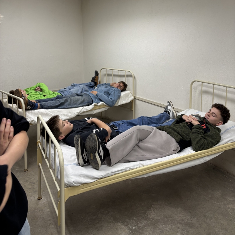 Naše objevování podzemního komplexu, stavěného v letech 1960 až 1964, začalo za pevnými železnými dveřmi v horním patře. Pan Beneš nám nejprve vysvětlil, co je vhodné mít v evakuačním zavazadle, a předvedl nám i základy sebeobrany. Poté jsme prošli místnosti, kde by se evakuovaní lidé po příchodu umyli a dostali čisté oblečení. Chlapci si dokonce vyzkoušeli, jak se v případě výpadku elektřiny obnovuje vzduch pomocí fyzické síly.